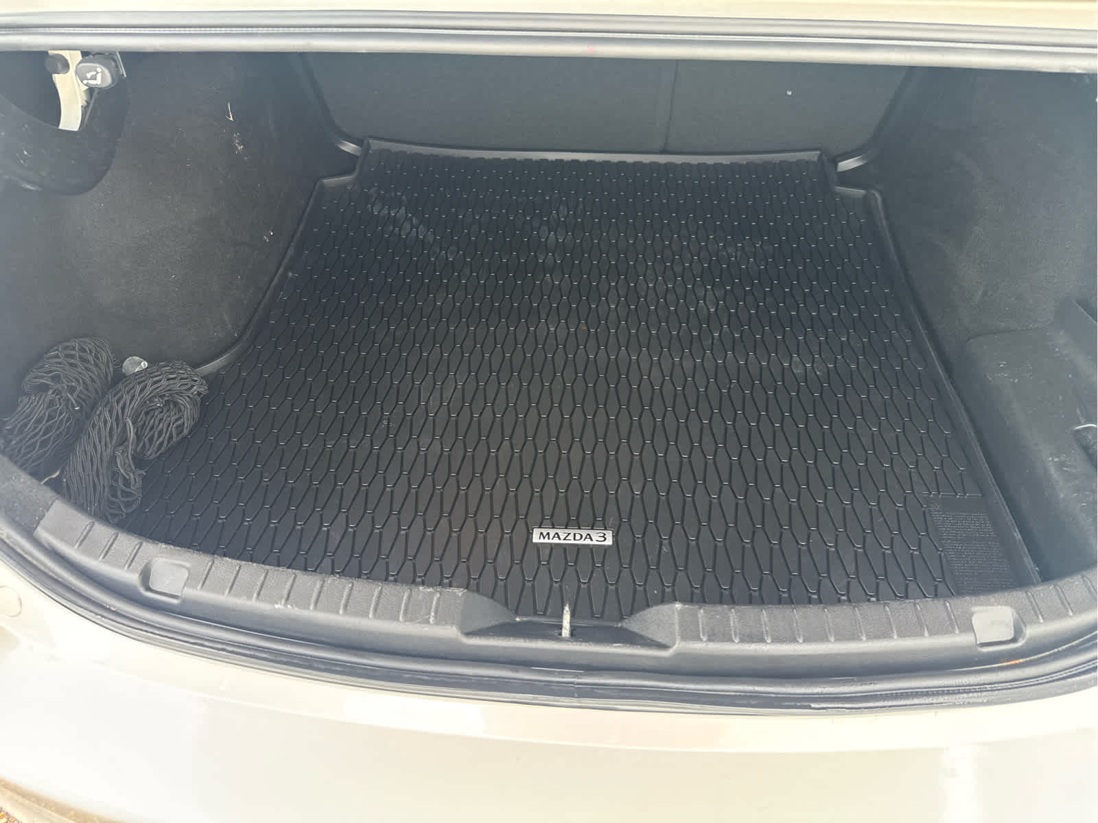 CARGO NET. Mazda Mazda3 Sedan 2.5 S Preferred with Snowflake White Pearl Mica exterior and Black interior features a 4 Cylinder Engine with 191 HP at 6000 RPM*.